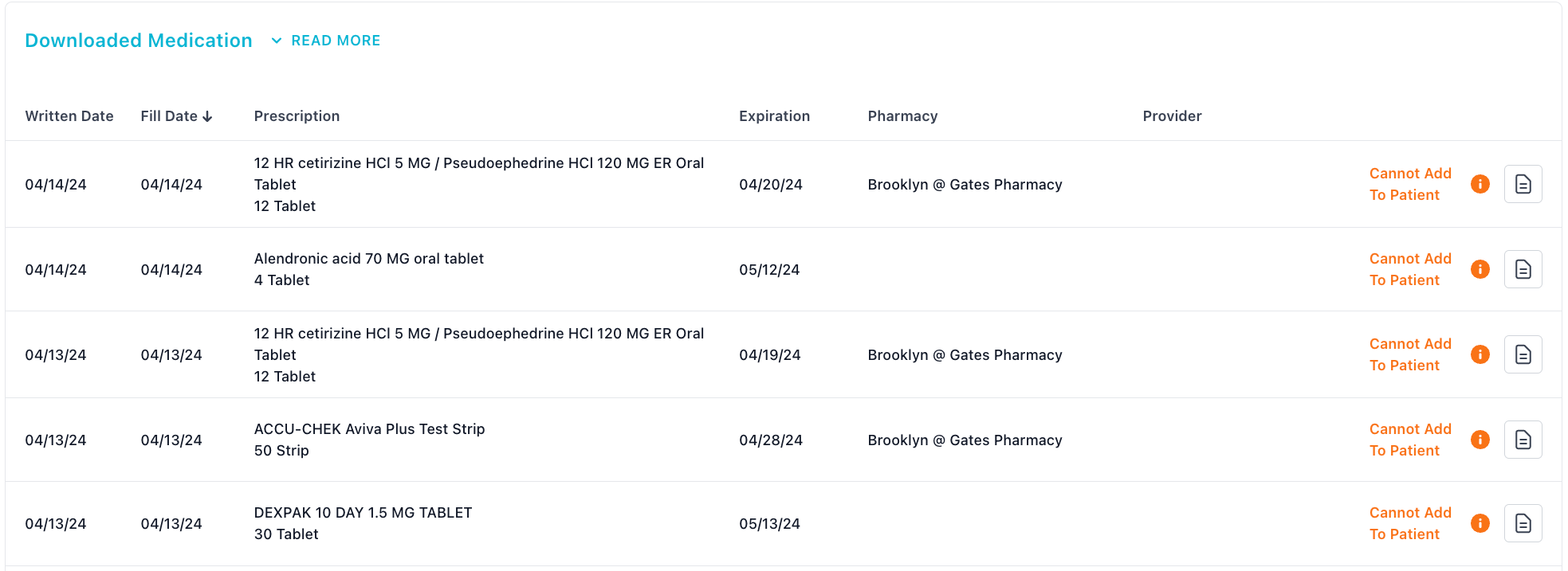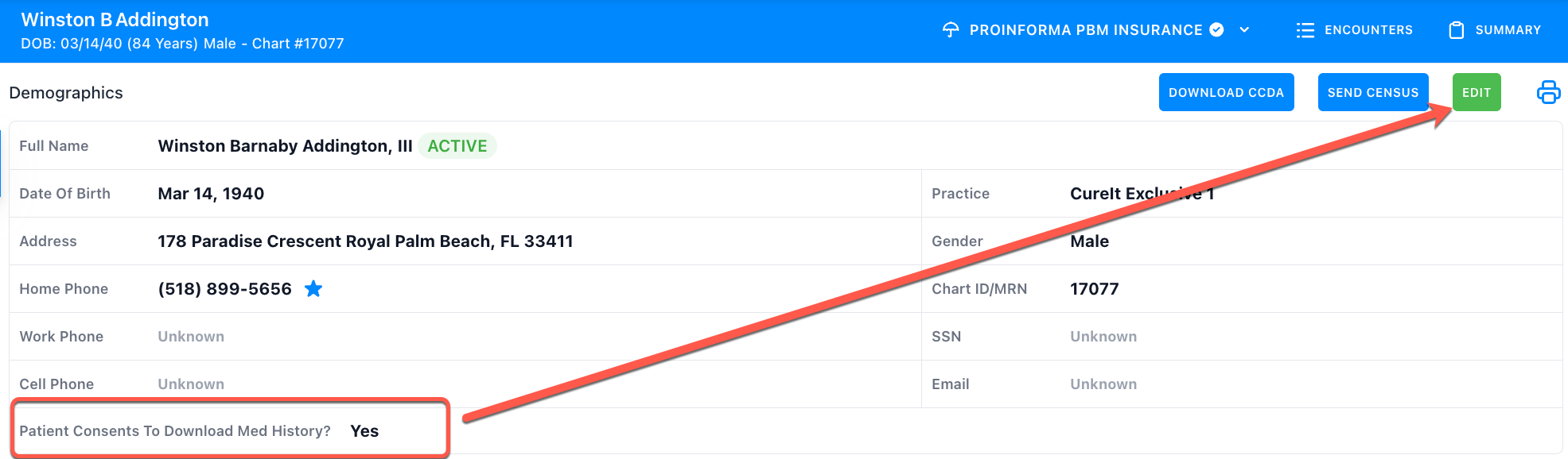 Note: As the data is provided by insurance companies, you will only see data for patient's that have insurance. Also, in order to obtain the drug history download, the Patient Consents to Downloaded Med History needs to be marked YES. If it is not marked yes, you can modify this on the patient demographics screen by clicking EDIT. The goal of this setting is to ensure you have asked your patient if you have their approval to obtain this data. See more on demographics here: Add New Patient