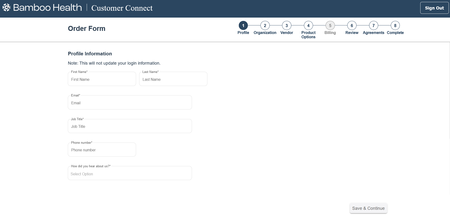 Please complete the profile information as displayed above. This includes name, email contact, phone, job title, and how you heard about us. All fields are required and once enter you can click Save & Continue at the bottom.