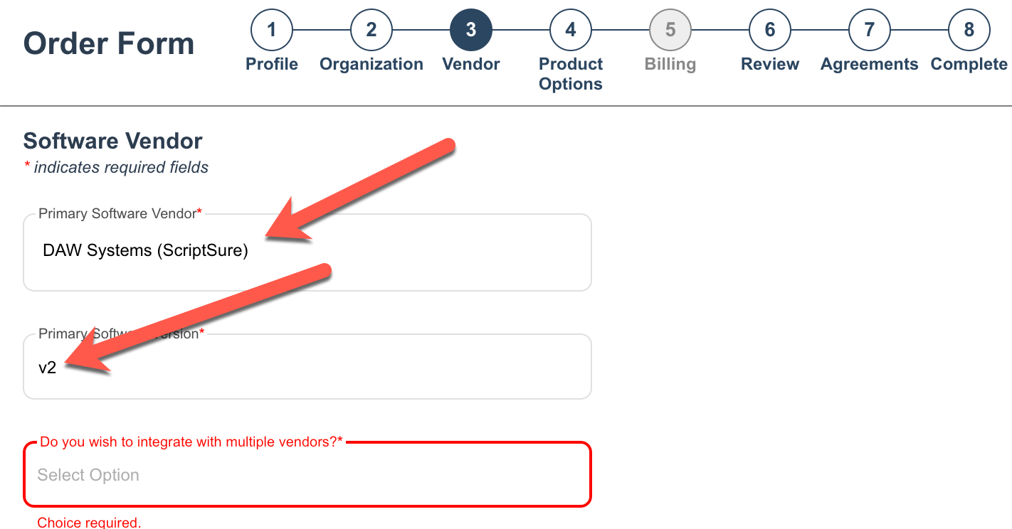 - Next you must select your Software Vendor (DAW SYSTEMS (SCRIPTSURE) and enter the Software Version V2. Vendor name is a searchable drop-down, in which other is an option; and you can enter a free-text name in a popup field that displays when other is selected. Software version is also free-text. An alert/disclaimer appears when you click Save & Continue. You can click Continue Editing to review/revise.