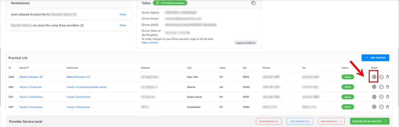 4. Click on the Gear Icon right across the practice that you'd like to edit.