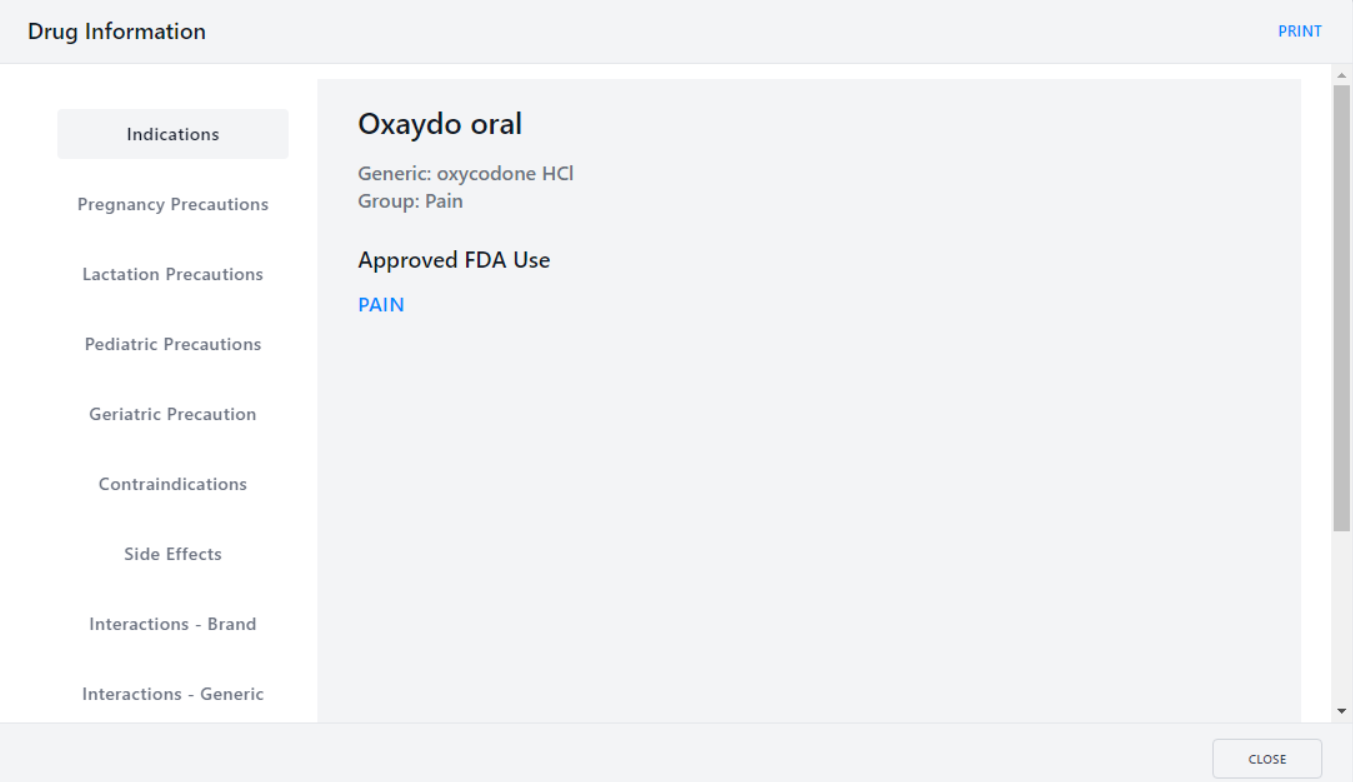 - Clicking here will bring up a list of drug information categories including, Indications, Pregnancy Precautions, Pediatric Precautions, Geriatric Precautions, Contraindications, Side Effects, Interactions- Brand, Interactions- Generic, Lab Interference, Medlineplus, and Patient Information.