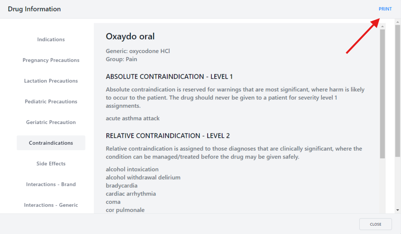 - You can print the drug information by selecting the category on the left that you want to print, and then choosing "Print".