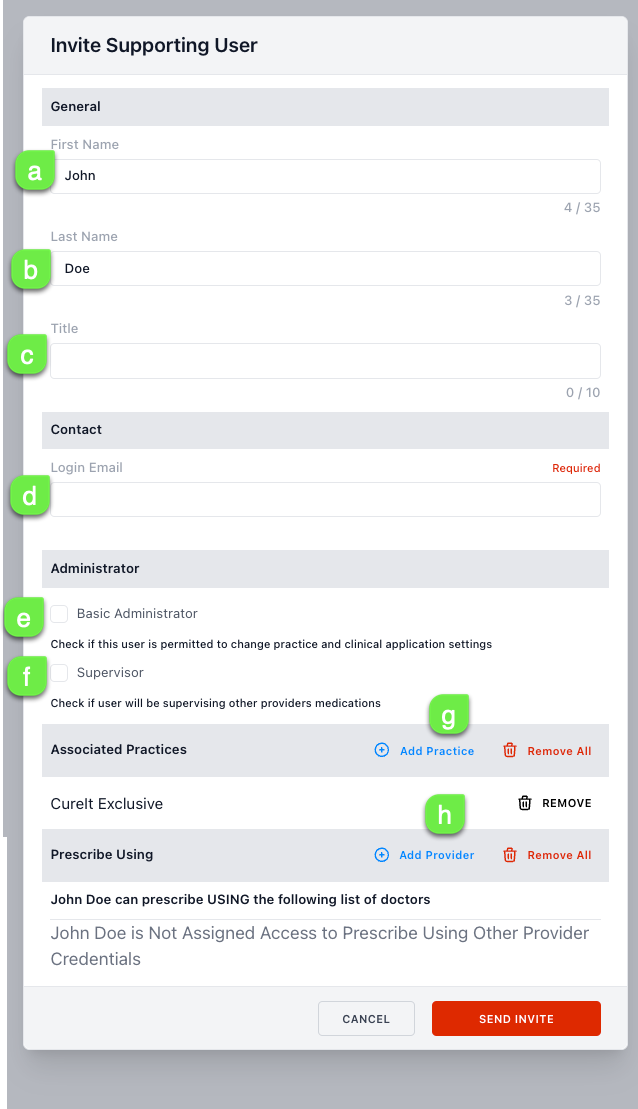 5. Prescribers and Supporting Users: Complete the following fields and then click "Send Invite".