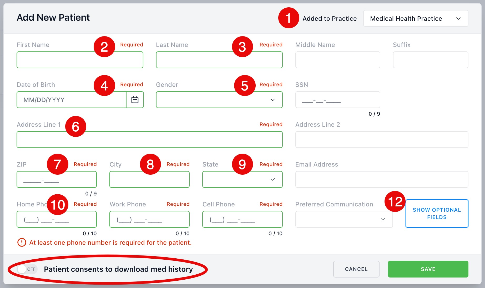 NOTE: All fields marked Required must be entered for each patient in order to be added to the system. All other fields and tabs are optional. Complete items marked 1-10 below. The circled area labelled "Patient consents to download med history" is an optional setting that can be turned on by sliding to button to the right. Doing this allows the application to access up to 12 months of the patient's filled medication history and view on-screen when the patient is selected.