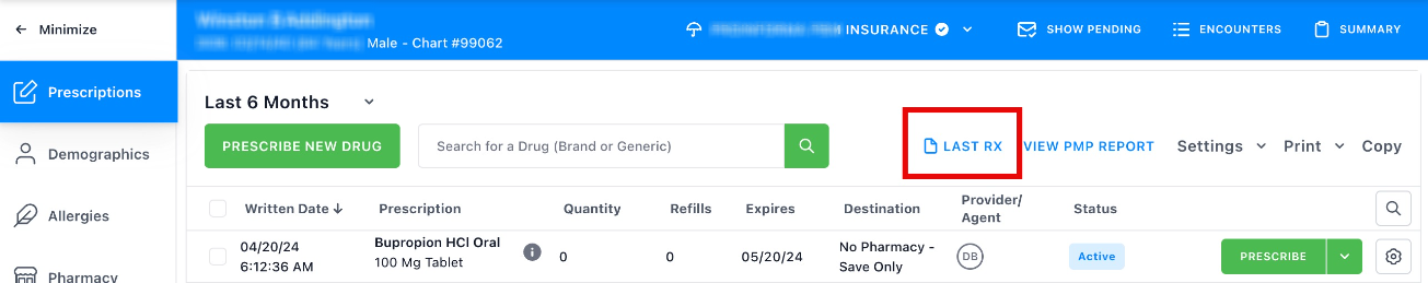 - Click "Last RX" to view scripts that were written during the last encounter.