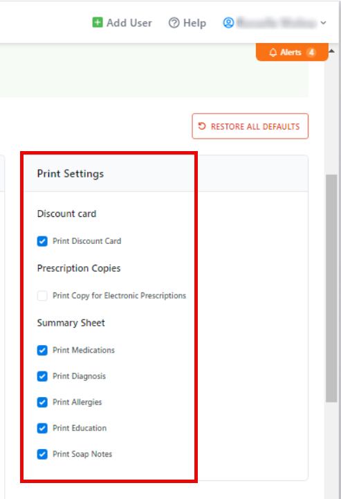 • Print Settings on the right hand side. Check the boxes to edit print settings for eRx copies and Summary Sheets: