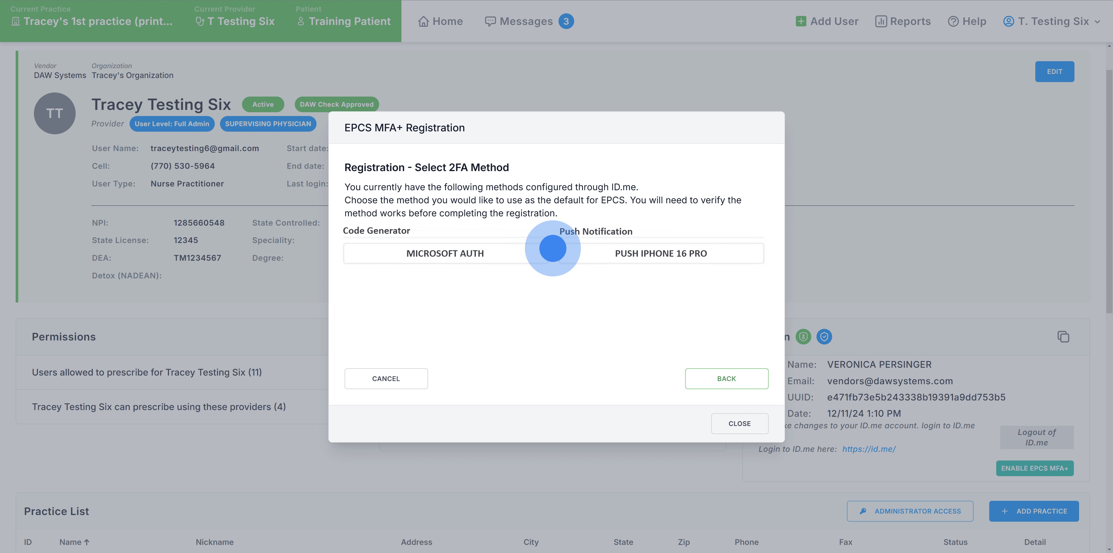The following new feature called EPCS MFA+ allows medical providers to avoid having to login with their ID.me username and password every time a controlled prescription is going to be sent. Instead, medical providers can create a 4-digit code to replace the ID.me login. This new feature carries the additional benefit of no longer accessing a separate window controlled by ID.me. Users no longer need to account for pop-up blocker and cross-site traffic enablement in the browser and on the device being used.