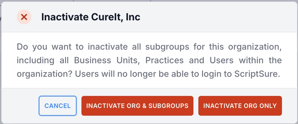 4. On the resulting popup you can choose to cancel inactivating the organization, inactivate the organization and all its subgroups, or inactivate the organization only.