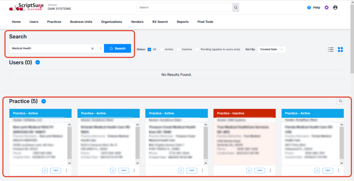 As you type, results will appear below the search bar, grouped by category (Users, Practices, Organizations, etc.).