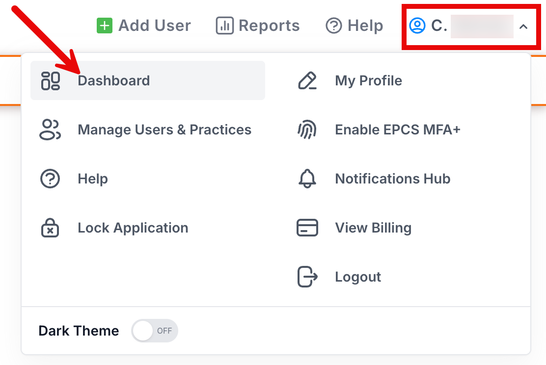 a. If your Dashboard is hidden, click your name in the upper right of ScriptSure and click Dashboard.
