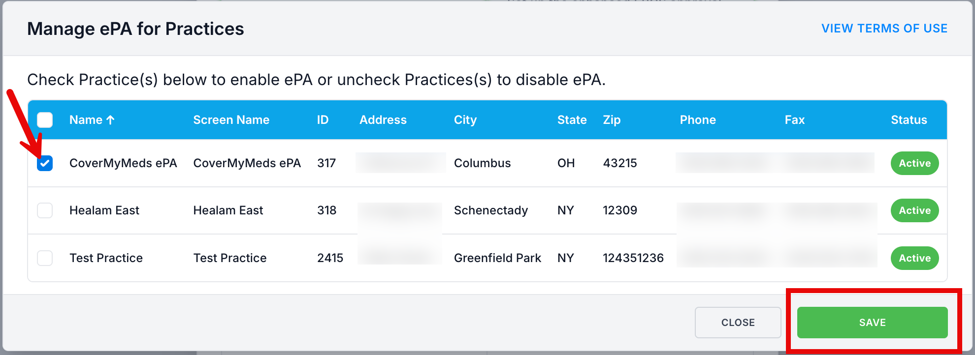 3. Check the practice you would like to enable ePA for, and click Save.