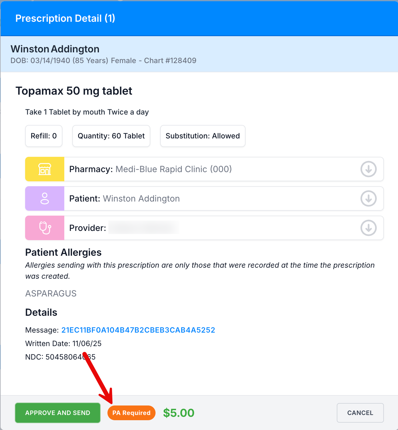 If a hold is not put on the prescription, click Send to Pharmacy. The Prescription detail window confirms a PA is required.