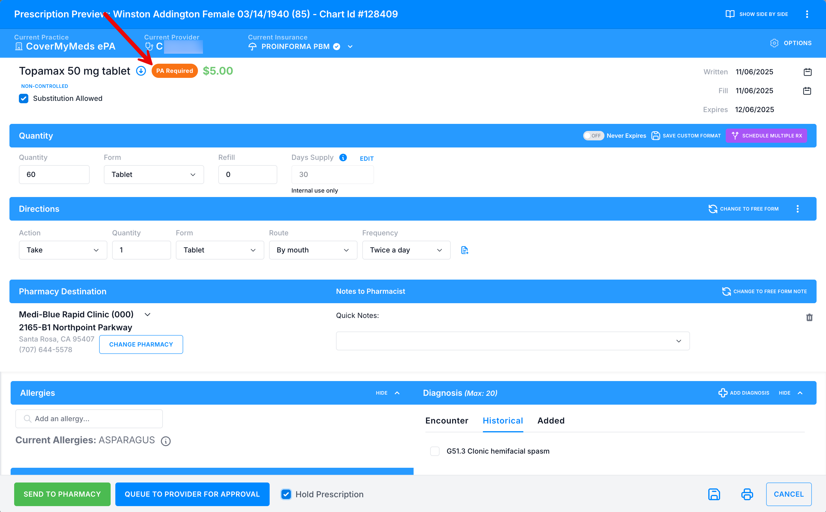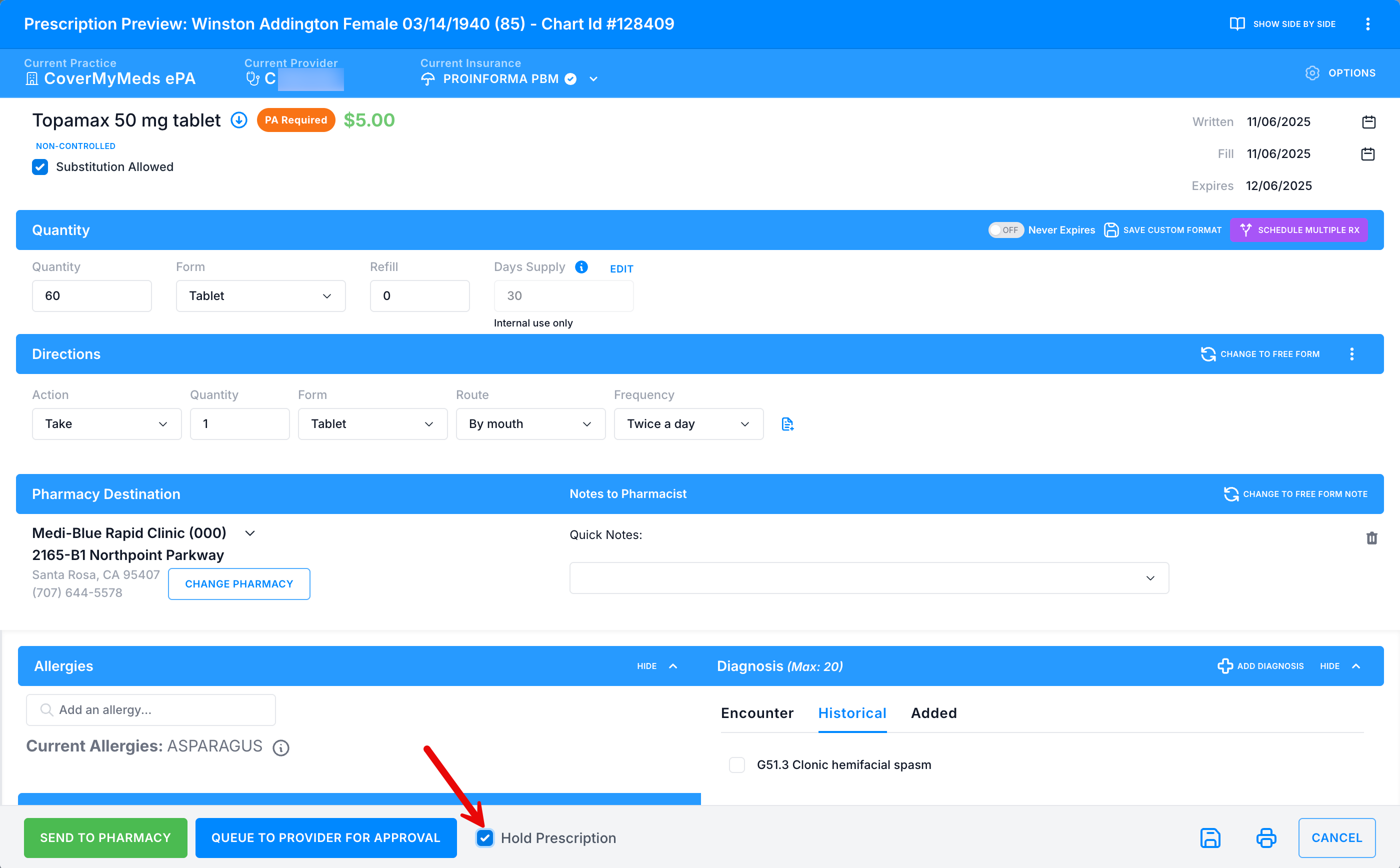 Hold checkbox - Hold the prescription for up to 3 hours until the PA questions are completed. This checkbox will prevent the prescription from sending immediately to the pharmacy until the required questions for the PA are completed by the provider. This is called a prospective ePA.