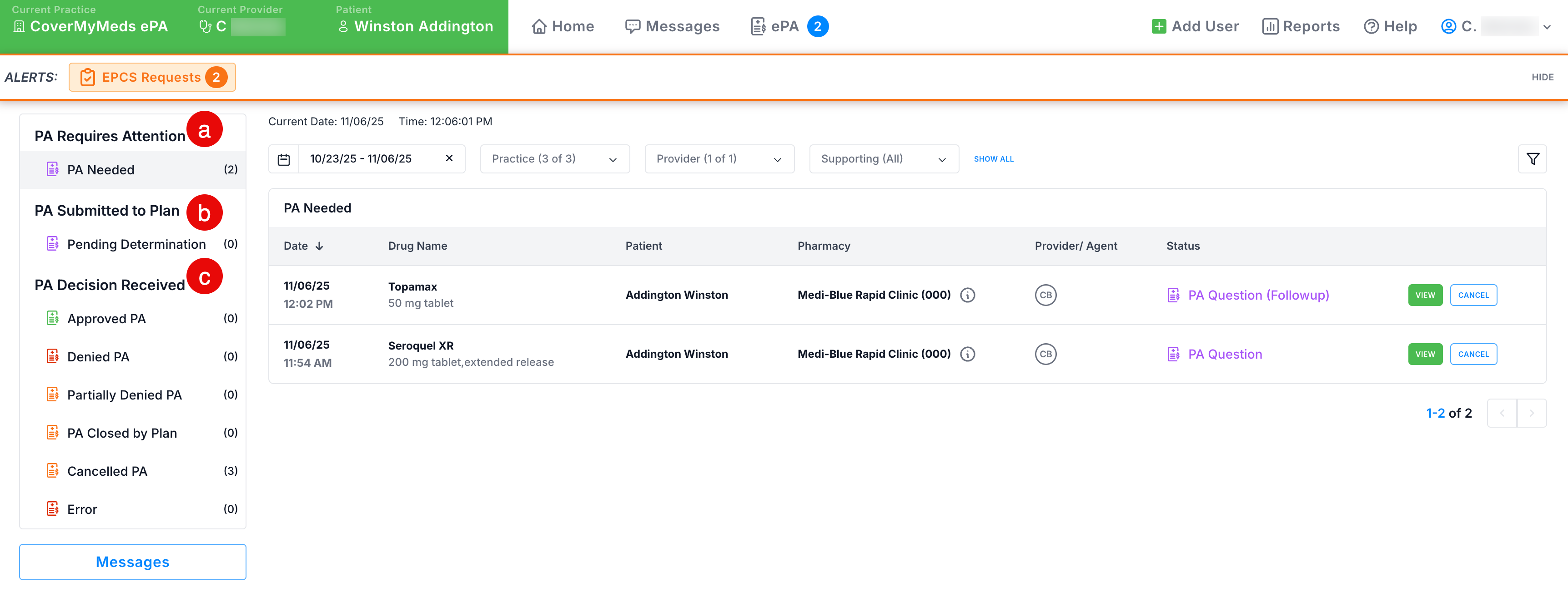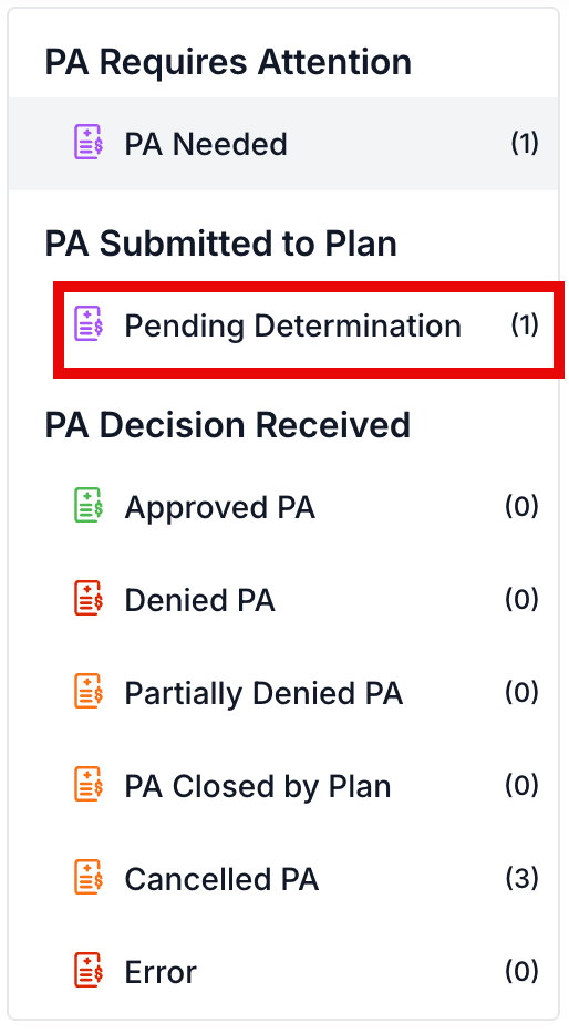 a. PA Requires Attention/PA Needed - an ePA that has been initiated and the questions are available for completion.