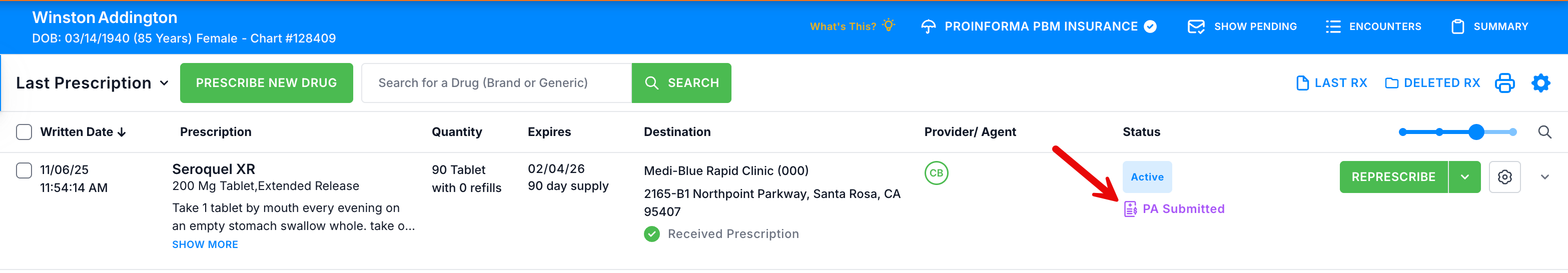 2. On the patient profile, the Status column changes to PA Submitted.