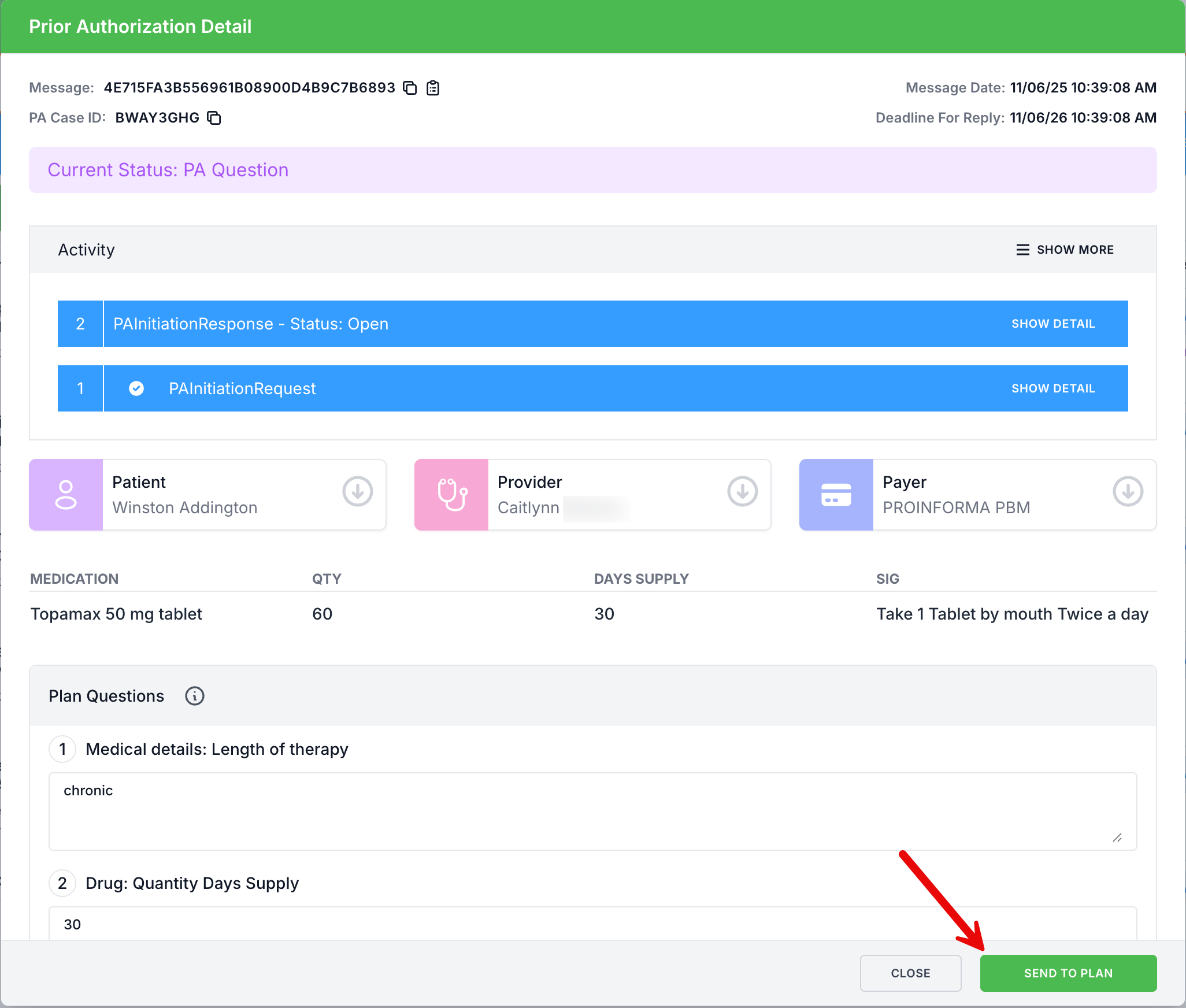 After clicking PA Question or clicking View on the ePA under ePA prompt in the top ribbon, the Prior Authorization Detail window will be displayed. Complete the required questions, and then click Send to Plan.