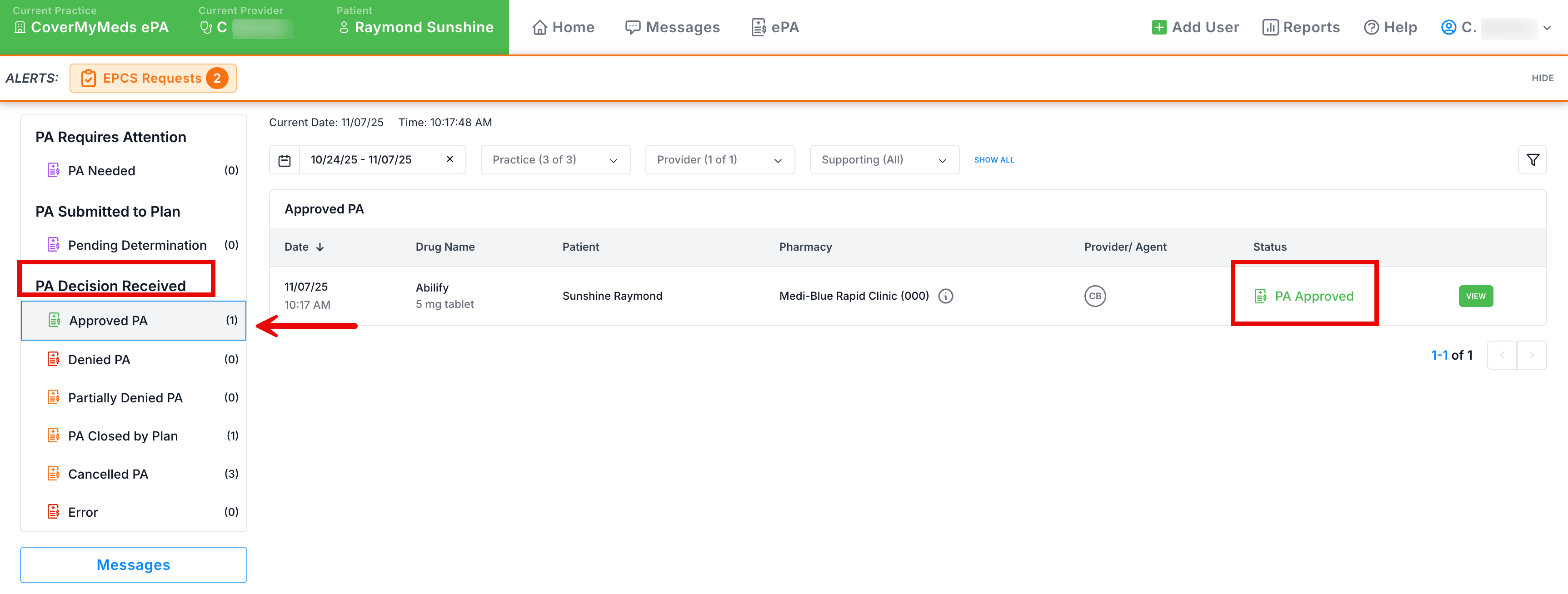 3. Once an ePA receives a decision from the insurance, it will move to a folder under the PA Decision Received heading. In the below screenshot, the PA was approved and moves to the Approved PA folder.