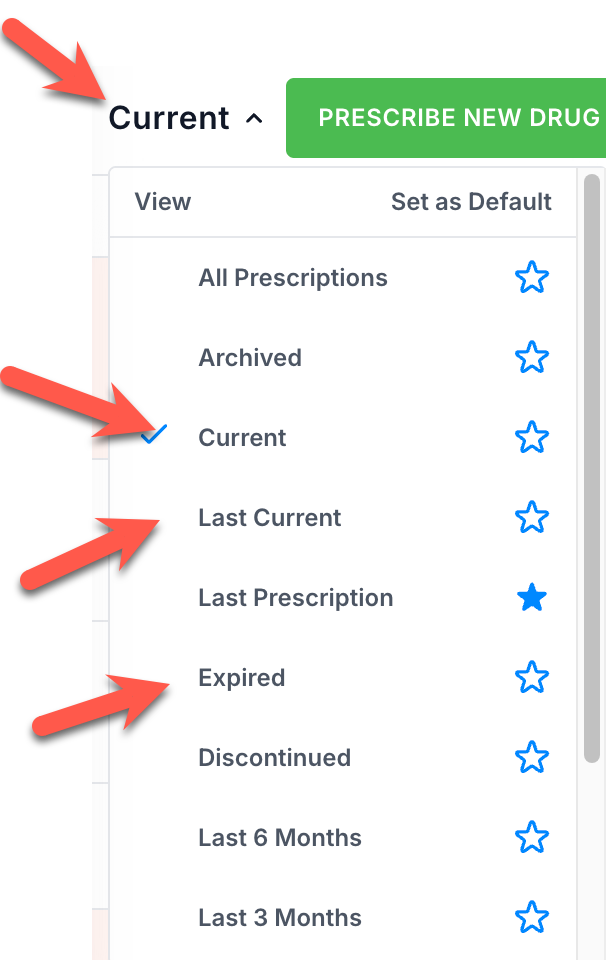ScriptSure includes special views that filter prescriptions based on whether they are considered current: Current, Last Current, and Expired.