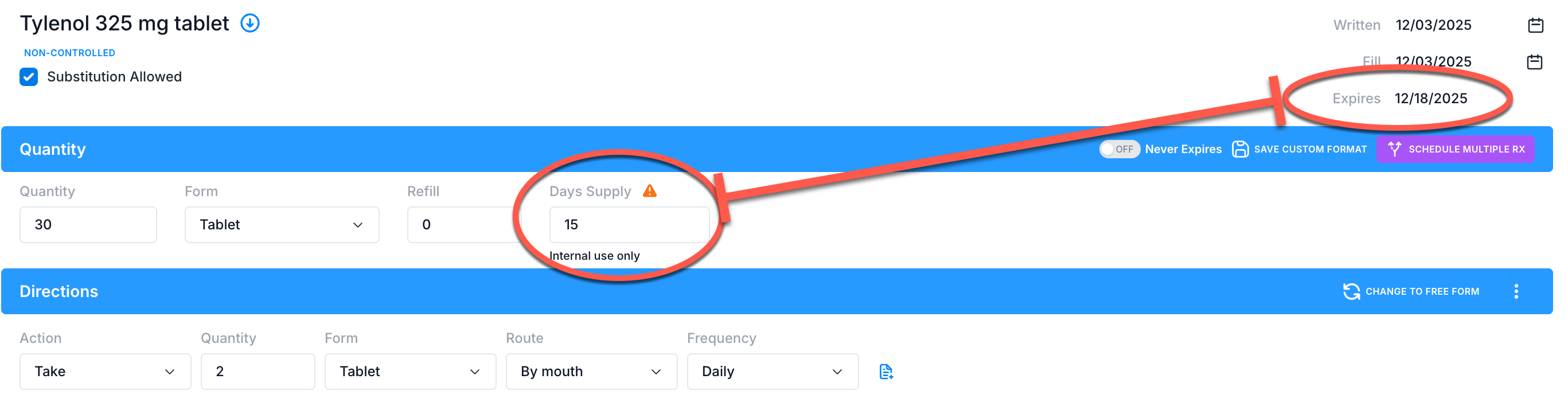 For standard prescriptions, ScriptSure automatically calculates the expiration date based on the prescribed quantity and directions.